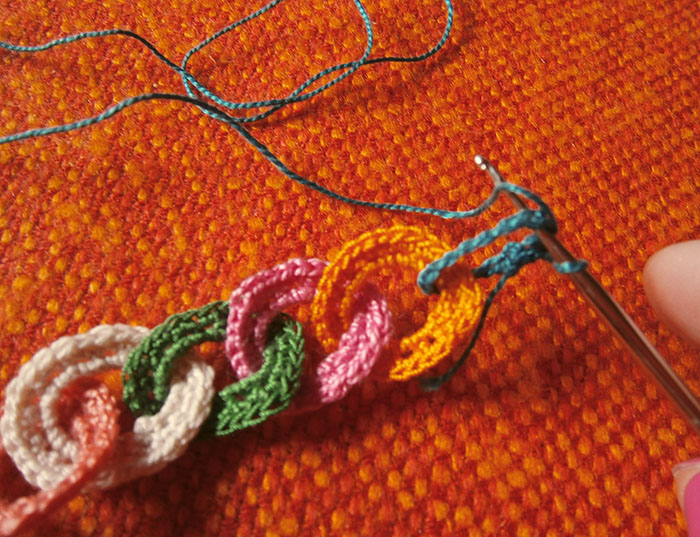 Ora avviate una seconda catenella di 15 m. con un altro colore, infilatela nel primo anello e chiudetela con una maglia bassissima.