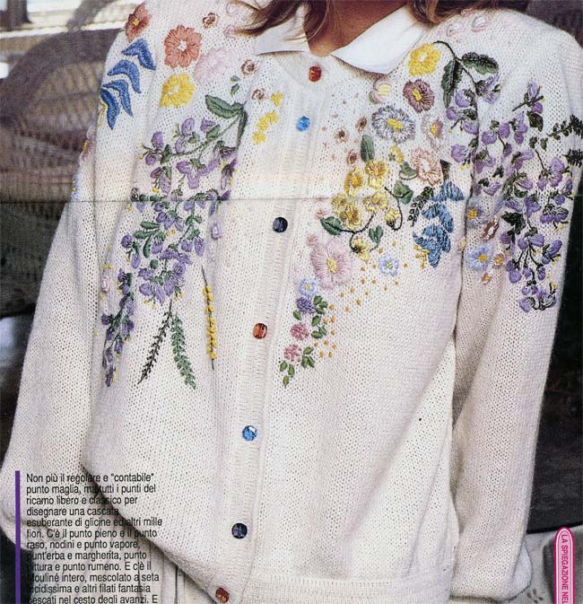 In quel periodo disegnavo con i colori da tessuto sulle magliette e non sapevo affatto ricamare. Ricordo che quando acquistai il numero di ottobre e mia figlia vide il cardigan écru ricamato a punti liberi (foto in galleria), decretò che dovevo assolutamente fargliela! Ed io per non deludere le sue aspettative mi sono procurata un libretto con i principali punti da ricamo (I 100 punti) e ho iniziato a provarli su pezzi di stoffa di scarto. Sono esattamente le istruzioni che vi posto di seguito, estratte dal famoso libretto che conservo ancora nel cesto da lavoro. In capo a poco tempo avevo appreso tutti i punti che mi servivano, eccetto il punto nodino e il punto vapore che mi sono riusciti correttamente solo in corso d’opera.
