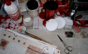 Con la forbice rifilate l’eccesso di carta dal bordo e procedete all’incollaggio della seconda facciata. Continuate così per altri 5 dischi (6 in tutto). Con un po’ di pazienza foderate anche la campana, che se vi crea qualche difficoltà, potete coprire in più riprese con più pezzi di carta anzichè usarne uno unico. Lasciate asciugare per qualche ora e poi spennellate tutte le superfici con la vernice per découpage. Fate nuovamente asciugare, quindi fissate il nastro di stoffa sui bordi con l’aiuto di qualche spillo su cui avrete infilato una perlina. Di solito tre sono più che sufficienti. Alla campana invece, passate il nastro da pacchi alla base e fate un giro alla sommità, bloccando con un po’ di colla.