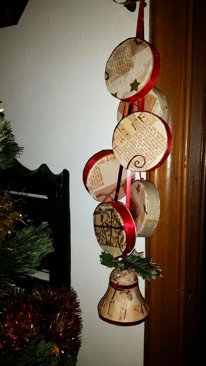 Tagliate dei pezzi di nastro rosso (di carta o di stoffa) lunghi circa un metro e fissate – sempre con uno spillo e una perlina – un disco ad ogni estremità. La campana avrà un nastro tutto per lei. Radunate i tre nastri con i dischi facendo in modo che ognuno risulti ad un’altezza diversa, infilate in mezzo il nastro della campana che dovrà essere il più lungo e chiudete con un nodo. Se volete, potete aggiungere due foglioline di pungitopo sulla campana, per darle maggior risalto.