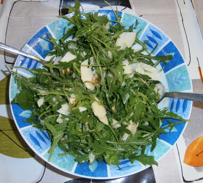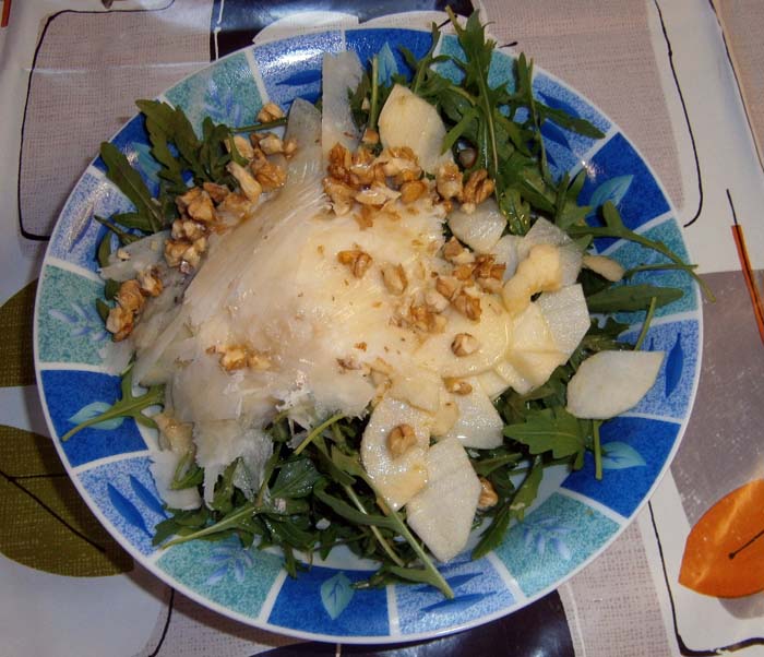 Il gusto amarognolo e pungente della rucola si smorza nell’incontro con il dolce della mela. Le sottili scaglie di parmigiano, sciogliendosi in bocca, si mescolano con gli altri due sapori e … quando arriva il pezzetto di noce, l’approccio è a dir poco sublime.