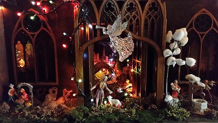 Ai piedi dell’albero su un prezioso, candido pizzo è fiorita una stella di Natale di feltro bianco mentre un angelo intona un melodioso canto per allietare il bambinello.